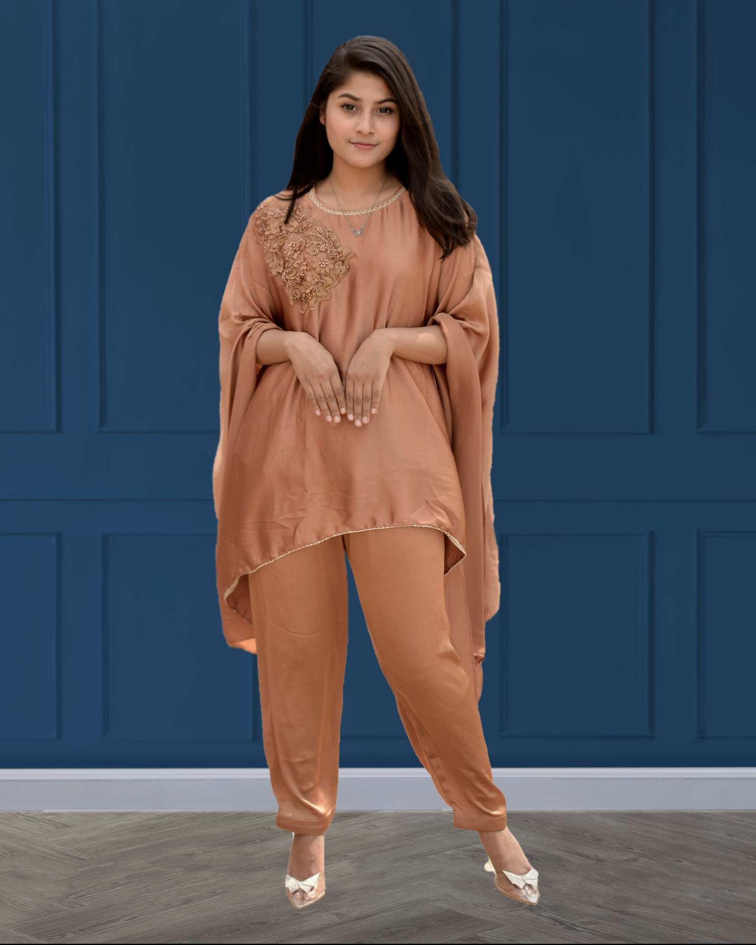 Copper Brown Rose Satin Elegent Kaftan Co-ord Set- 037