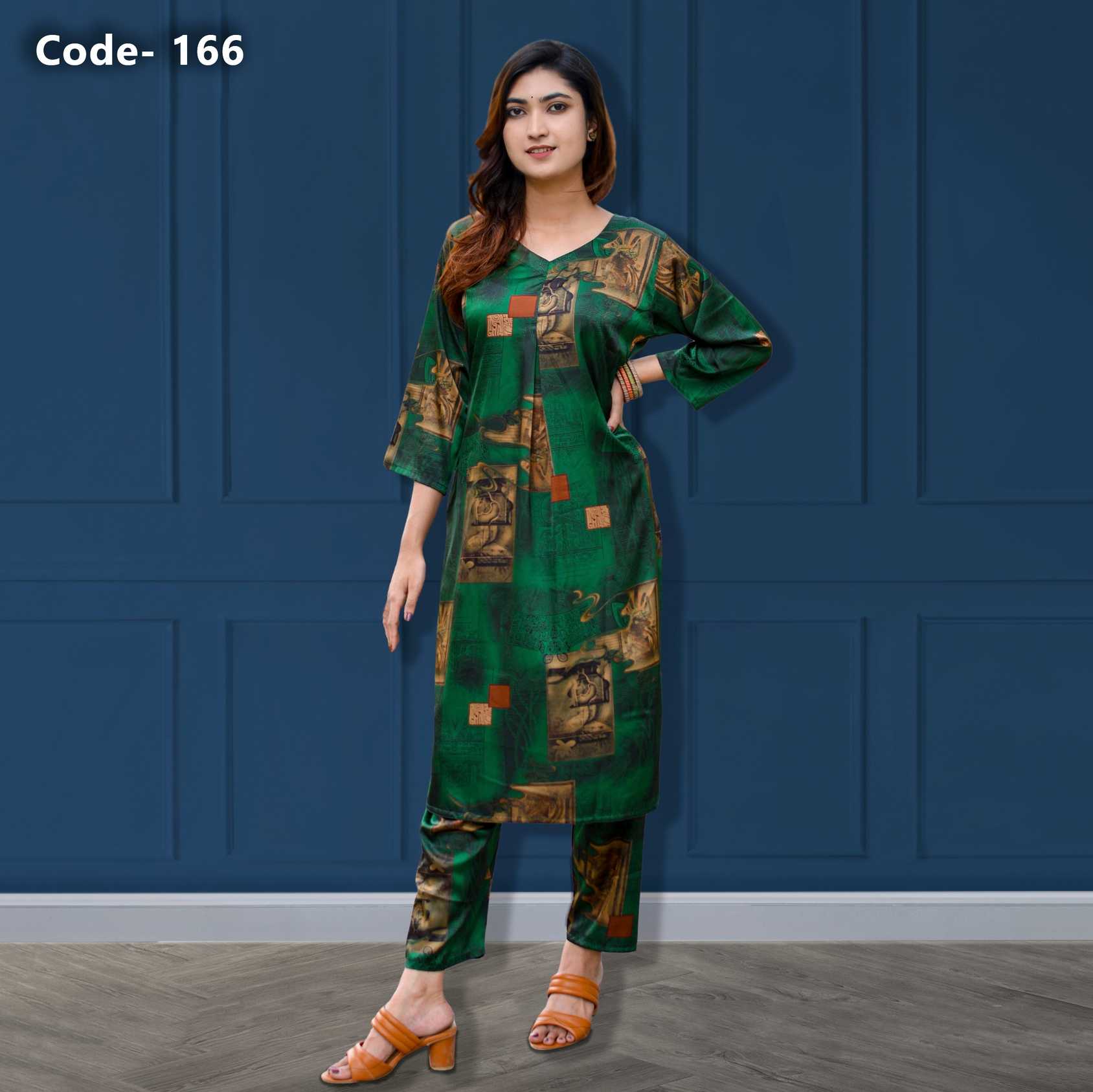 Emerald Green Digital Print Coord Set With Brown Accents- 166