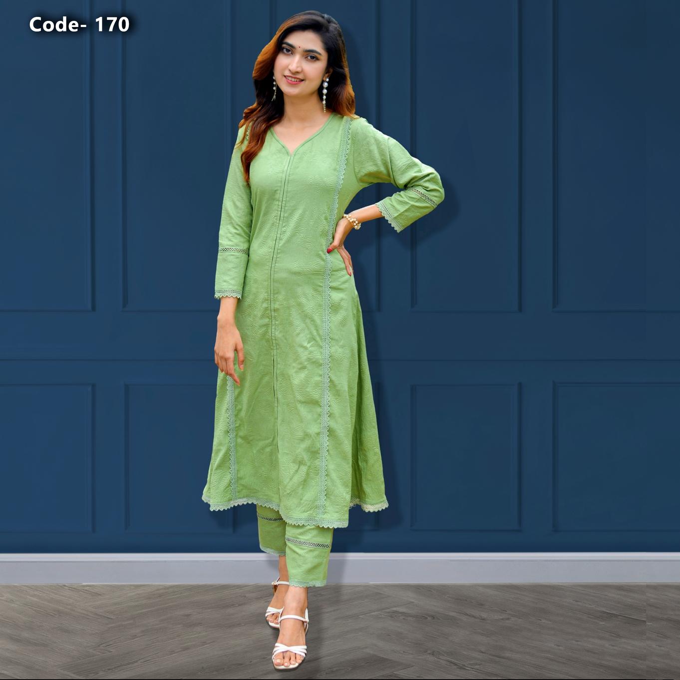 Lime Green V-Neck Coord Set with Lace Detailing- 171